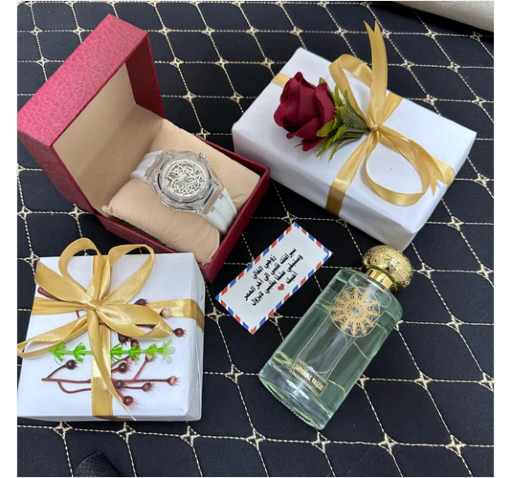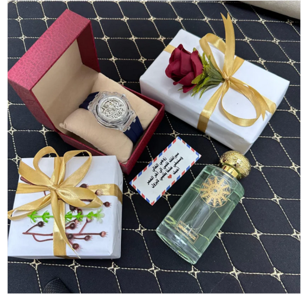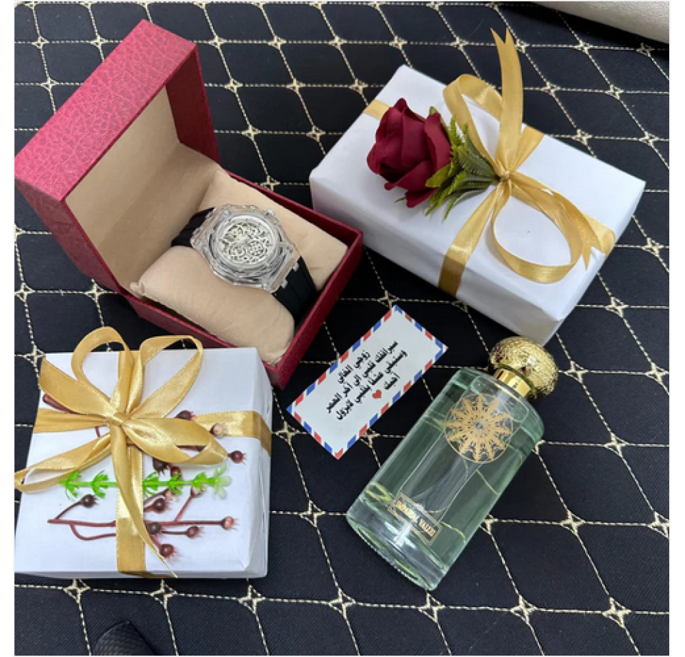 يحتوي على: ساعة رجالية تصميم هوبلت. عطر قصة 100 مل. 3. كرت إهداء *شامل التغليف